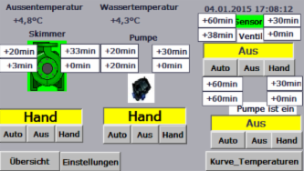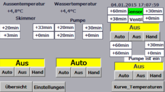 Hier eine Ansicht in der die Pumpe für den Skimmer ausgeschaltet ist und die Pumpe (Grundpumpe) auf Automatik geschaltet wurde aber nicht in betrieb ist. Der Sensor zeigt den zu geringen Wasserstand an. Eine Optionale Pumpe (zum Wasserstand senken und Filter reinigen) ist ausgeschaltet. Immer links über den Taster Auto ist die Soll und darunter die Ist Zeit für die Automatikfunktion. Das gleiche gilt für den Schalter Hand. Es wird die aktuelle Temperatur des Wassers und der Luft angezeigt.