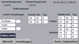 Auf eine Seite für die Einstellungen kann ein Fütterungsautomat (optional) mit Fütterungszeiten verwaltet werden. (Futtermenge wird nach Außentemperatur berechnet)